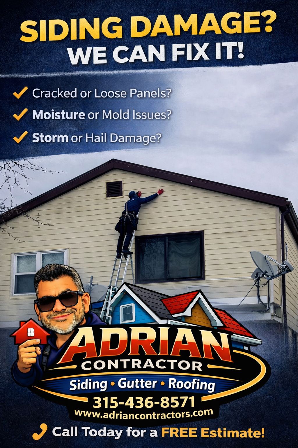 If you’re looking for reliable siding repair or replacement services in Central New York, trust our professionals at Adrian contractor LLC With our expertise and competitive pricing, we are the perfect choice for you if you are looking to improve your home’s siding.